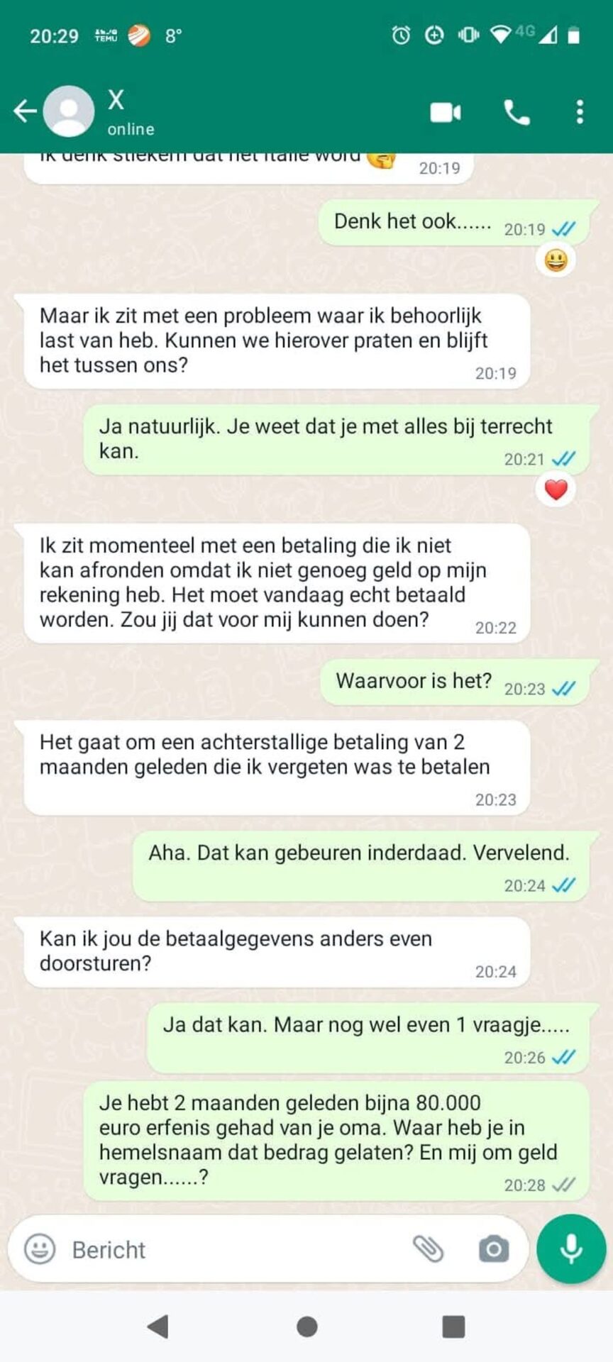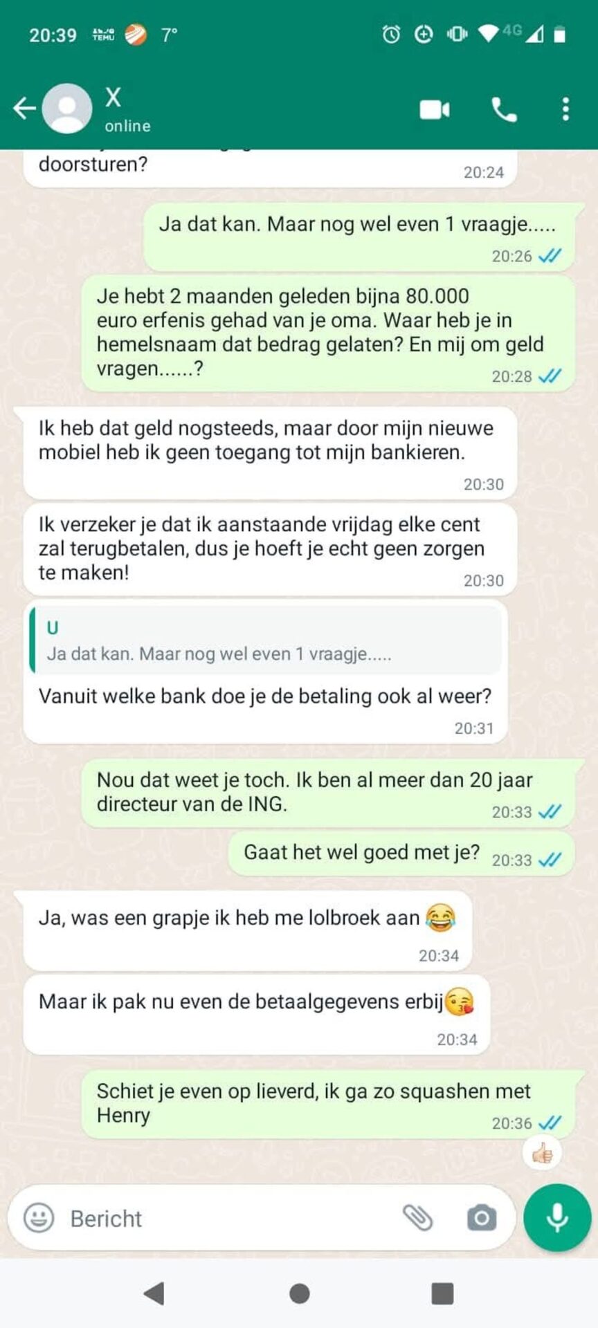 De oplichter stuurde een bericht met een dramatisch verhaal over zijn telefoon die stuk was, gevolgd door een dringende oproep om hem geld te sturen voor een nieuwe.
