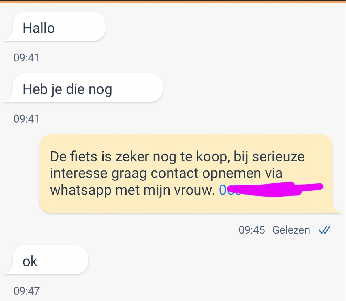 Stel had een fiets te koop op Marktplaats gezet, maar het liep al snel anders dan ze hadden verwacht. Wat begon als een simpele verkoop, eindigde in een eindeloos verwarrend gesprek.