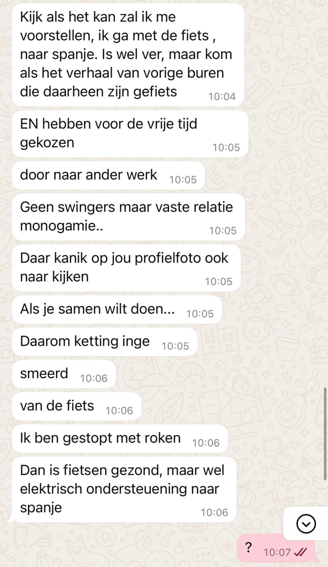 Het gesprek ging van de ene bizarre vraag naar de andere, zonder dat het ooit ergens naartoe leidde. De koper leek niet echt geïnteresseerd in de fiets, maar stelde wel allerlei vragen die niets met de verkoop te maken hadden.