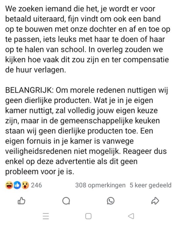 De ouders wilden iemand die goed kon omgaan met hun dochter, maar hun eisen gingen verder dan dat. Ze waren op zoek naar iemand die bereid was om zich volledig in te zetten voor hun kind, en hadden specifieke verwachtingen over de verantwoordelijkheden die de oppas zou hebben. Het idee van een au pair is niet nieuw, maar dit stel had bijzondere voorwaarden die mogelijk niet door elke kandidaat als even haalbaar of redelijk werden ervaren. …….