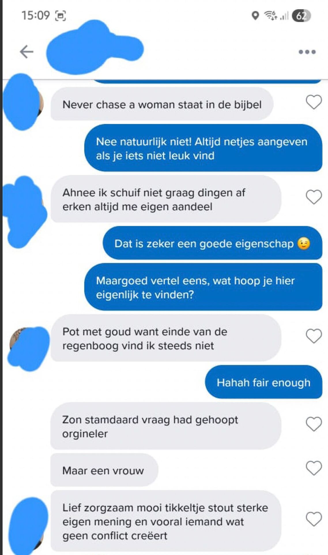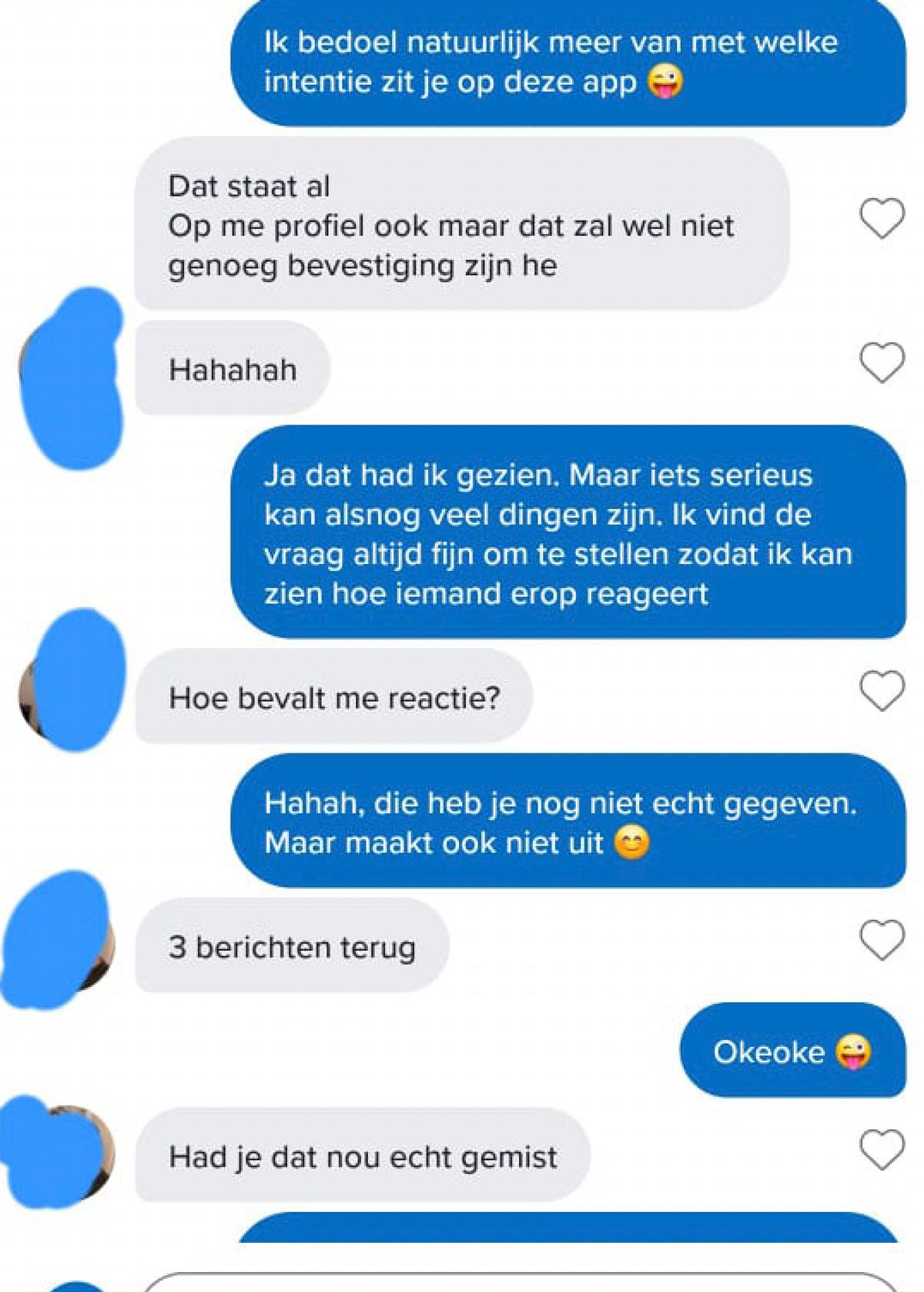 Tom reageerde met een korte uitleg: “Nou ja, je bent oké. Niet mijn type, maar je hebt wel een leuke uitstraling.” Maaike was even stil van de eerlijkheid, maar besloot het gesprek niet te laten vallen. “Bedankt voor je eerlijkheid,” stuurde ze terug, “maar ik dacht dat Tinder juist was voor het vinden van iemand die je leuk vindt.”