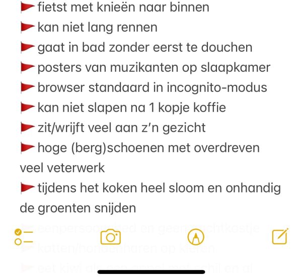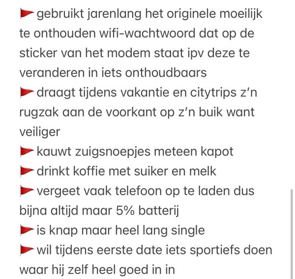 Sommige mensen maken uitgebreide lijsten van wat ze als ‘red flags’ beschouwen bij potentiële partners. Het kan gaan om kleine gedragingen, zoals een man die altijd te laat is, tot grotere problemen zoals een gebrek aan eerlijkheid of manipulatief gedrag. Wanneer deze lijst echter extreem lang of bijzonder gedetailleerd is, kan het een teken zijn van overbezorgdheid of het vermijden van kwetsbaarheid in relaties.