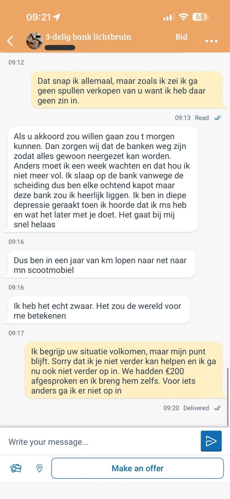 Nina kon de gedachte aan de bank niet loslaten. Ze besloot haar situatie eerlijk te delen met de verkoper. “Ik begrijp het als je niet kunt helpen, maar ik wil je gewoon laten weten dat ik echt graag die bank wil hebben. Mijn situatie is momenteel erg moeilijk.”