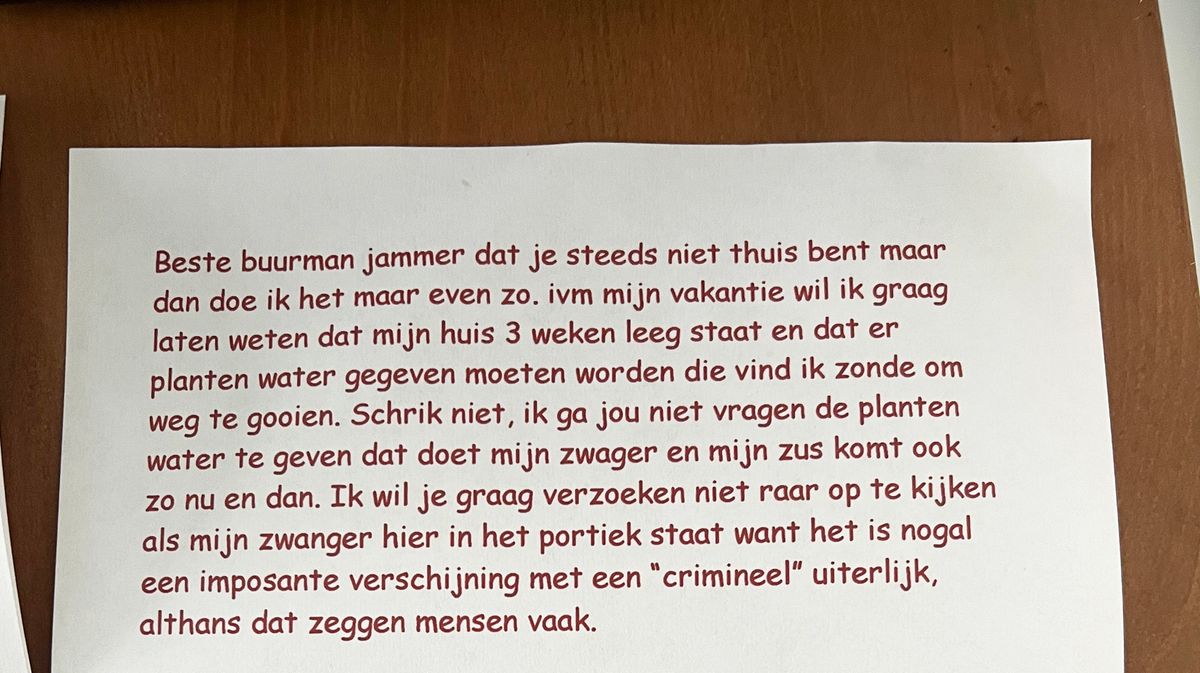 Lisa was al maanden aan het aftellen naar haar vakantie naar Italië. Ze had alles geregeld: de tickets, de hotelreserveringen, en natuurlijk de zorg voor haar huis en planten. Omdat ze drie weken weg zou zijn, besloot ze haar buren een brief te schrijven met een paar belangrijke aandachtspuntjes voor tijdens haar afwezigheid.