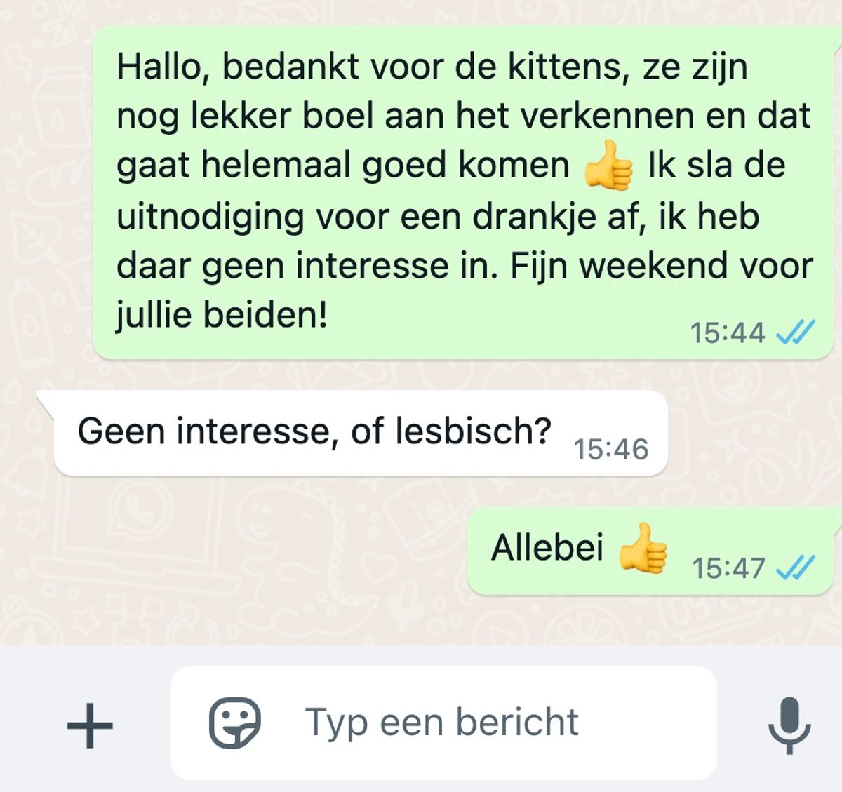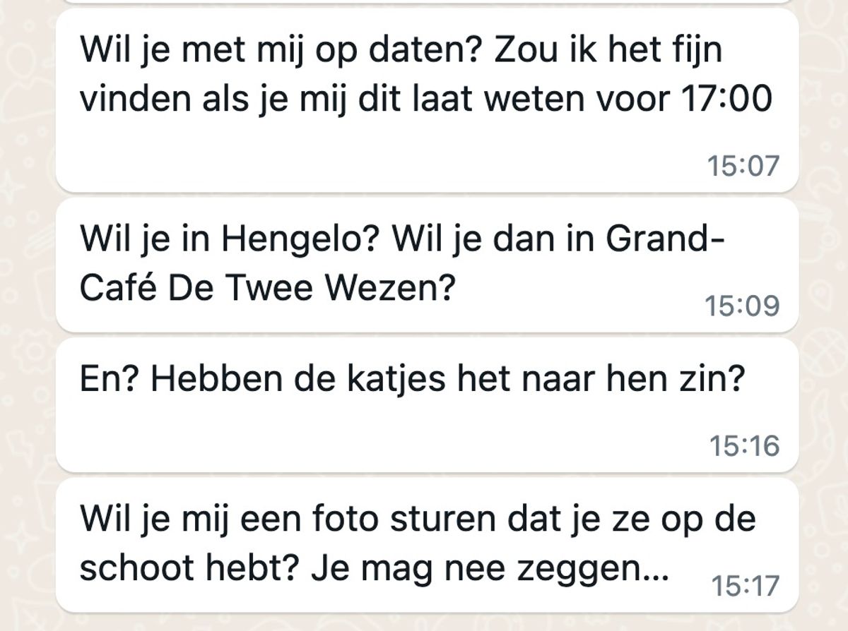 “Eh, dank je wel,” antwoordde Laura, niet zeker hoe ze moest reageren. Maar de man ging door. “Misschien kunnen we ooit een keer koffie drinken, je hebt echt een mooie energie. Ik zou het leuk vinden om je beter te leren kennen.” Laura was verbaasd. Dit was het laatste wat ze had verwacht na de kittenaankoop.