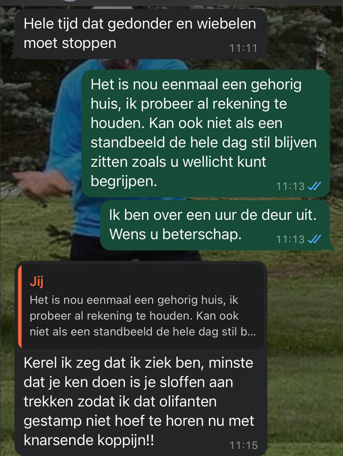 Na nog een paar minuten van het onafgebroken gestamp besloot Julia het niet langer te laten zitten. Ze pakte haar telefoon en stuurde een bericht naar haar vriendin Sophie, die altijd vol goede ideeën zat. “Sophie, ik lig ziek op bed en de bovenbuurman stampvoet weer rond. Hoe kan ik hem subtiel laten weten dat ik zijn gedoe niet kan verdragen?” vroeg ze.
