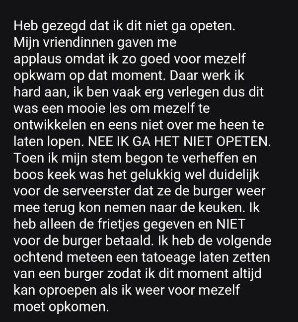 In haar review benadrukte ze hoe onhandig de enorme burger voor haar was. Ze was duidelijk niet blij dat ze het monster van een burger niet op haar gebruikelijke manier kon eten.