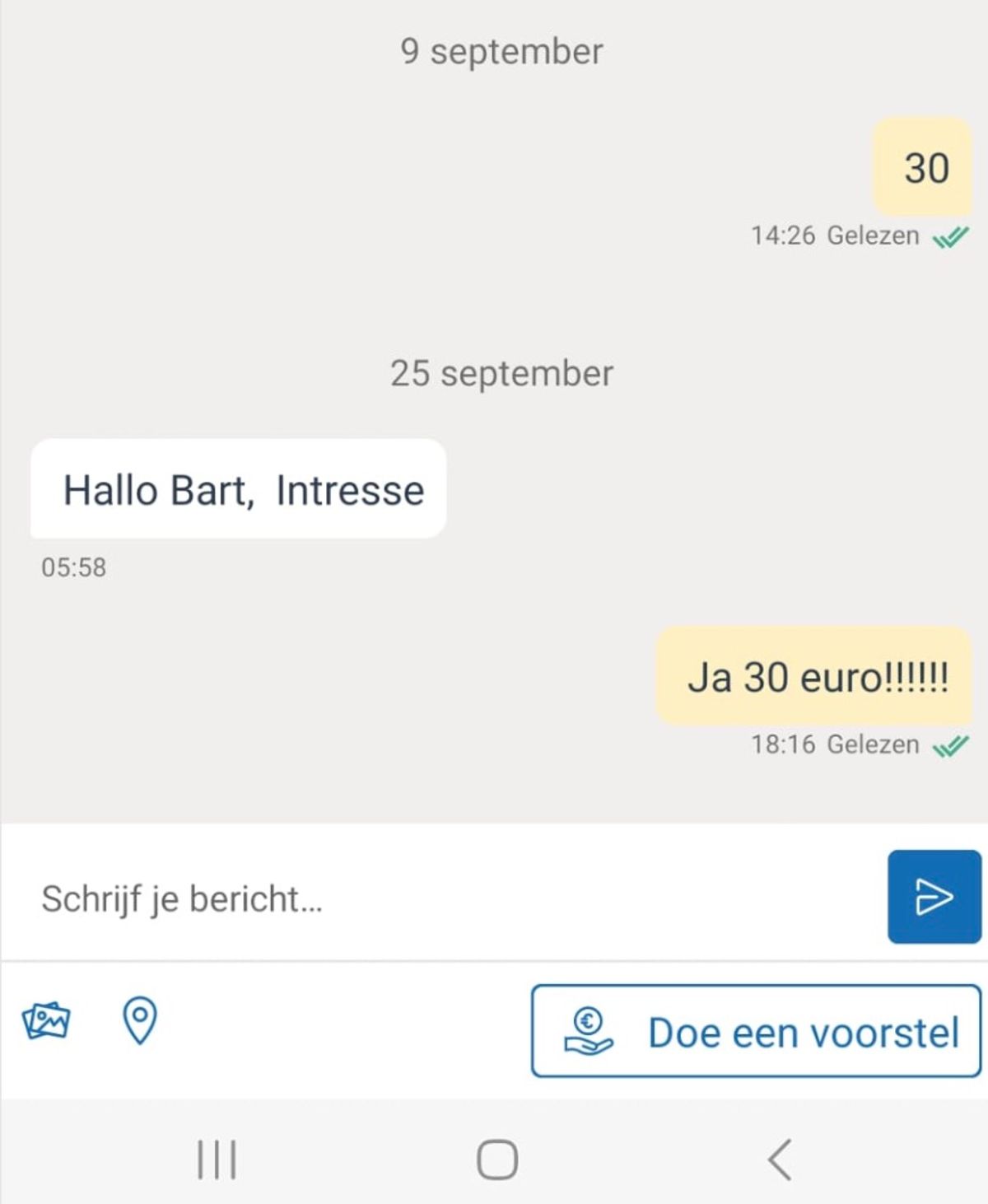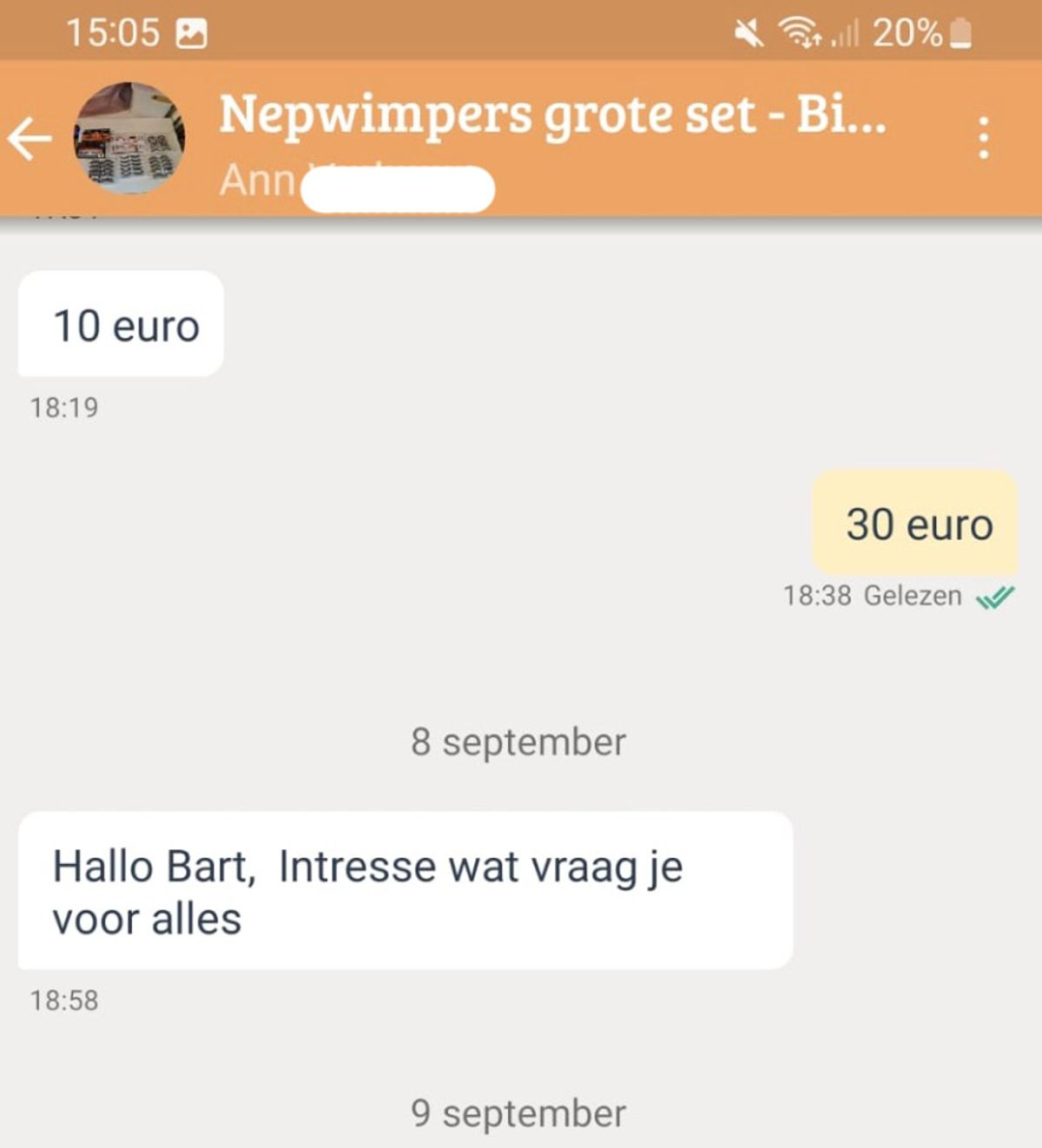 De vrouw stuurt een bericht waarin ze vraagt naar de beschikbaarheid en de prijs van de wimpers. De verkoper reageert kortaf, zonder veel uitleg.