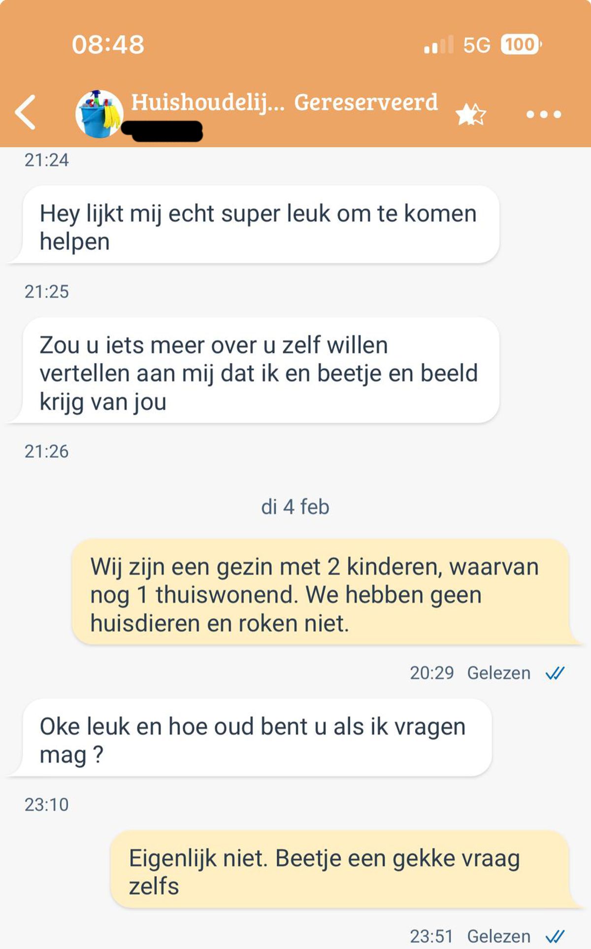“Dat klinkt niet echt professioneel,” schreef Sanne terug. “Ik zoek iemand die echt serieus is over het schoonmaken, niet iemand die persoonlijke aanbiedingen doet.” Maar Tom bleef doorgaan: “Dat begrijp ik, maar ik ben gewoon vriendelijk en kan je wel wat extra aandacht geven als je dat wilt.” Zijn berichten maakten haar ongemakkelijker, en ze begon zich af te vragen wat voor type persoon hij echt was.