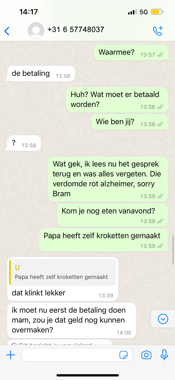 WhatsApp-oplichter die zich voordoet als zoon van de familie wordt lekker gemaakt met Winston Gerschtanowitz die ineens voor de deur staat