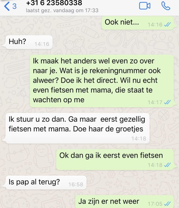 Een ander waarschuwingssignaal is als er geen persoonlijkheid in het gesprek zit. Een bericht zoals “Hallo, kan ik je snel even spreken? Het is dringend” zonder verder detail is verdacht. Leg altijd het gesprek vast, en geef nooit zomaar persoonlijke informatie of klik op links in berichten van onbekende nummers. Controleer altijd of het bericht echt afkomstig is van degene die het zegt te zijn.