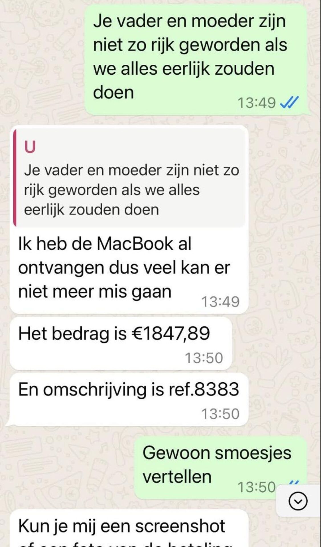 Zit je lekker te lunchen met collega’s in een peperduur restaurant in Dubai, komt je niet-bestaande kind weer om geld zeuren via WhatsApp!