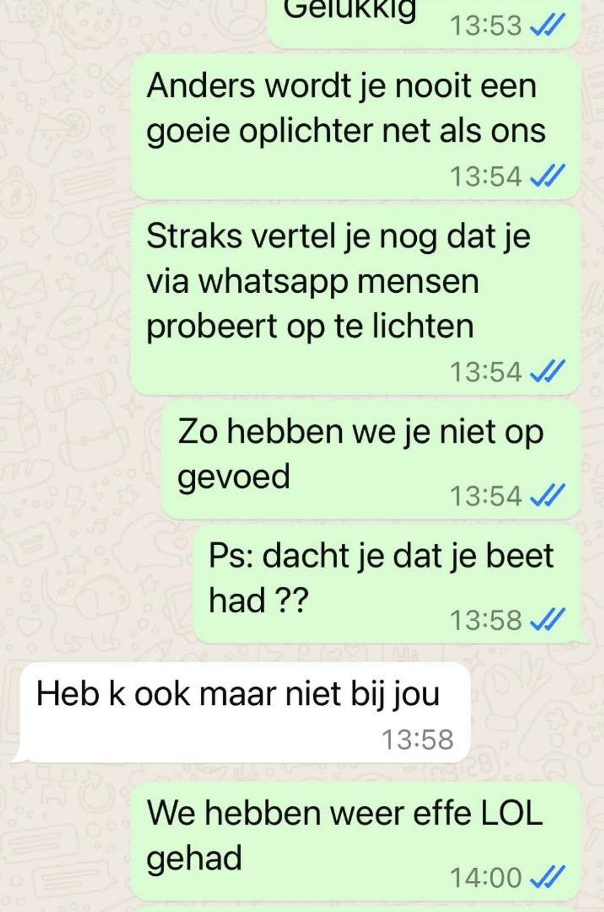 Je had gelukkig geen geld gestuurd, maar het voelde goed om anderen bewust te maken van dit soort fraude. De rest van de dag voelde iets lichter, wetende dat je je ervaring had gedeeld en anderen had geholpen waakzaam te blijven.